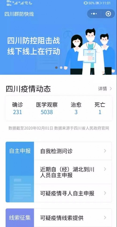 2月3日,四川迅速上線了"四川群防快線平臺(tái)",提供個(gè)人疫情防控信息自主申報(bào)、在線自我檢測(cè)、專家視頻問(wèn)診、可疑疫情線索上報(bào)、權(quán)威信息發(fā)布、違反防控規(guī)定行為舉報(bào)等在線服務(wù)。